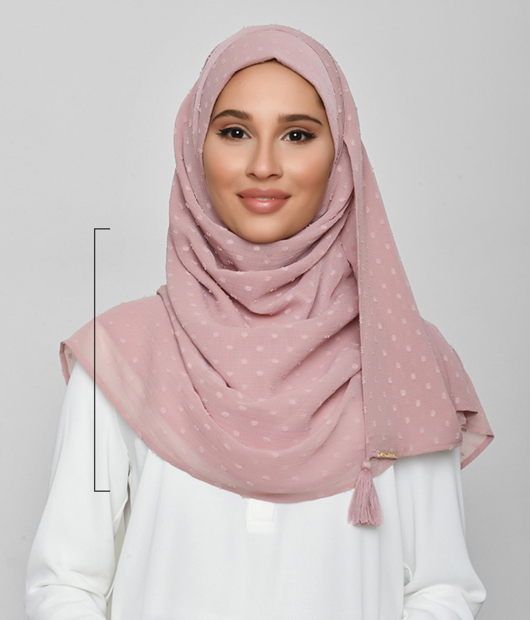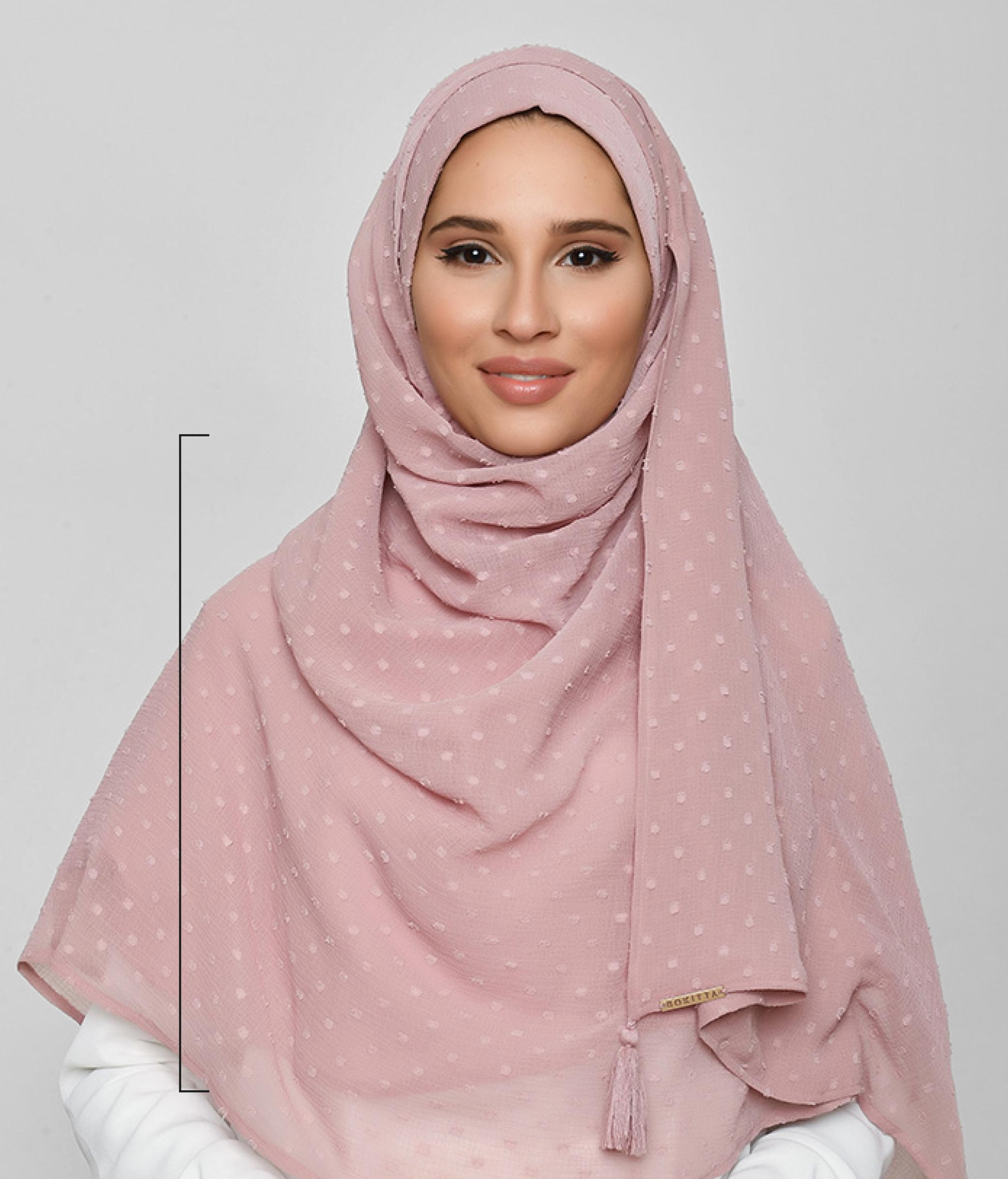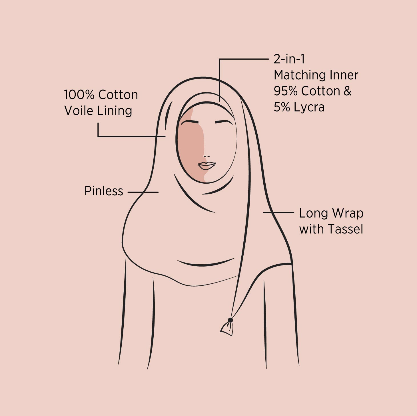 It features an Arab inspired fully wrapped style with a tassel on the side to give you the perfect wrapped hijab look effortlessly, without using a single pin!