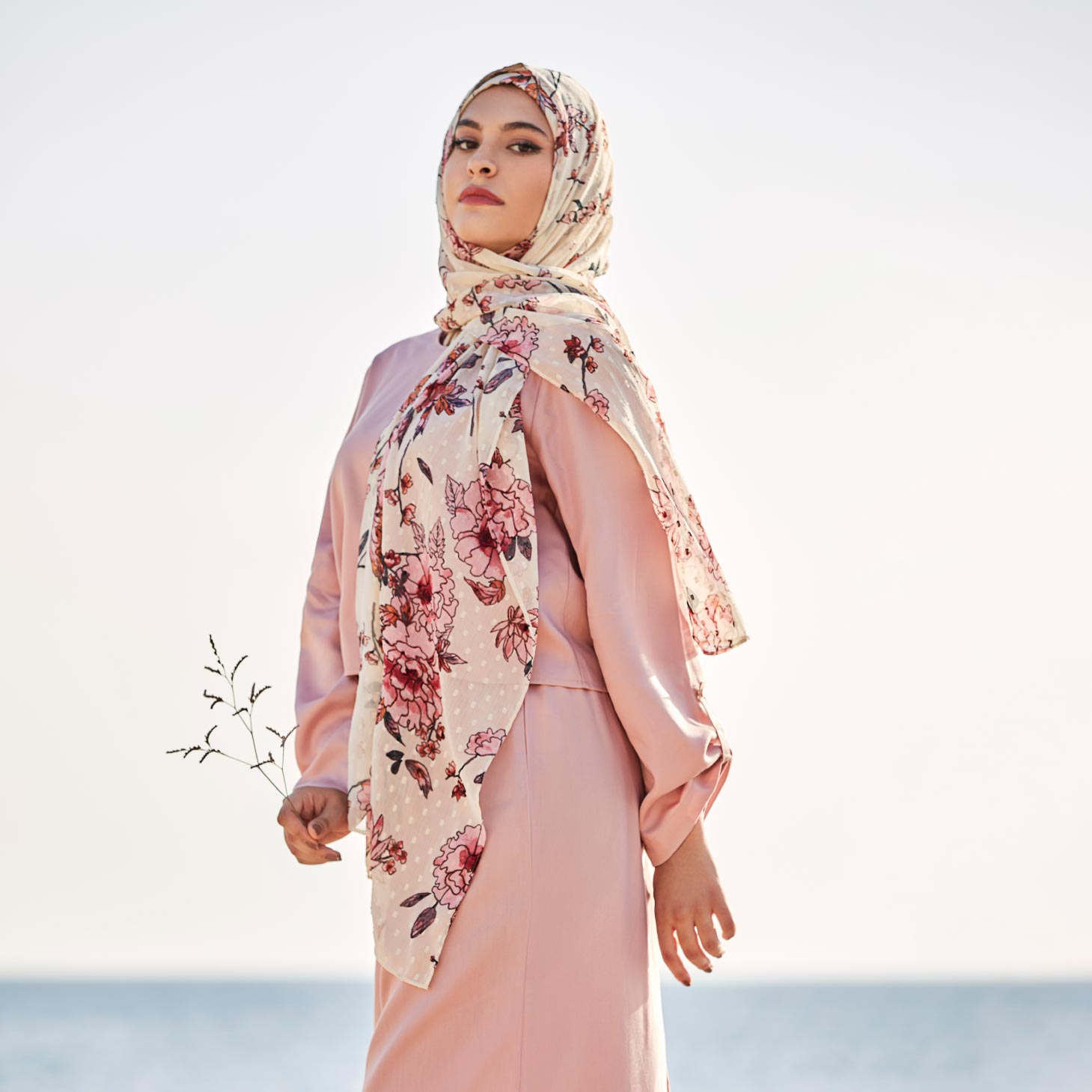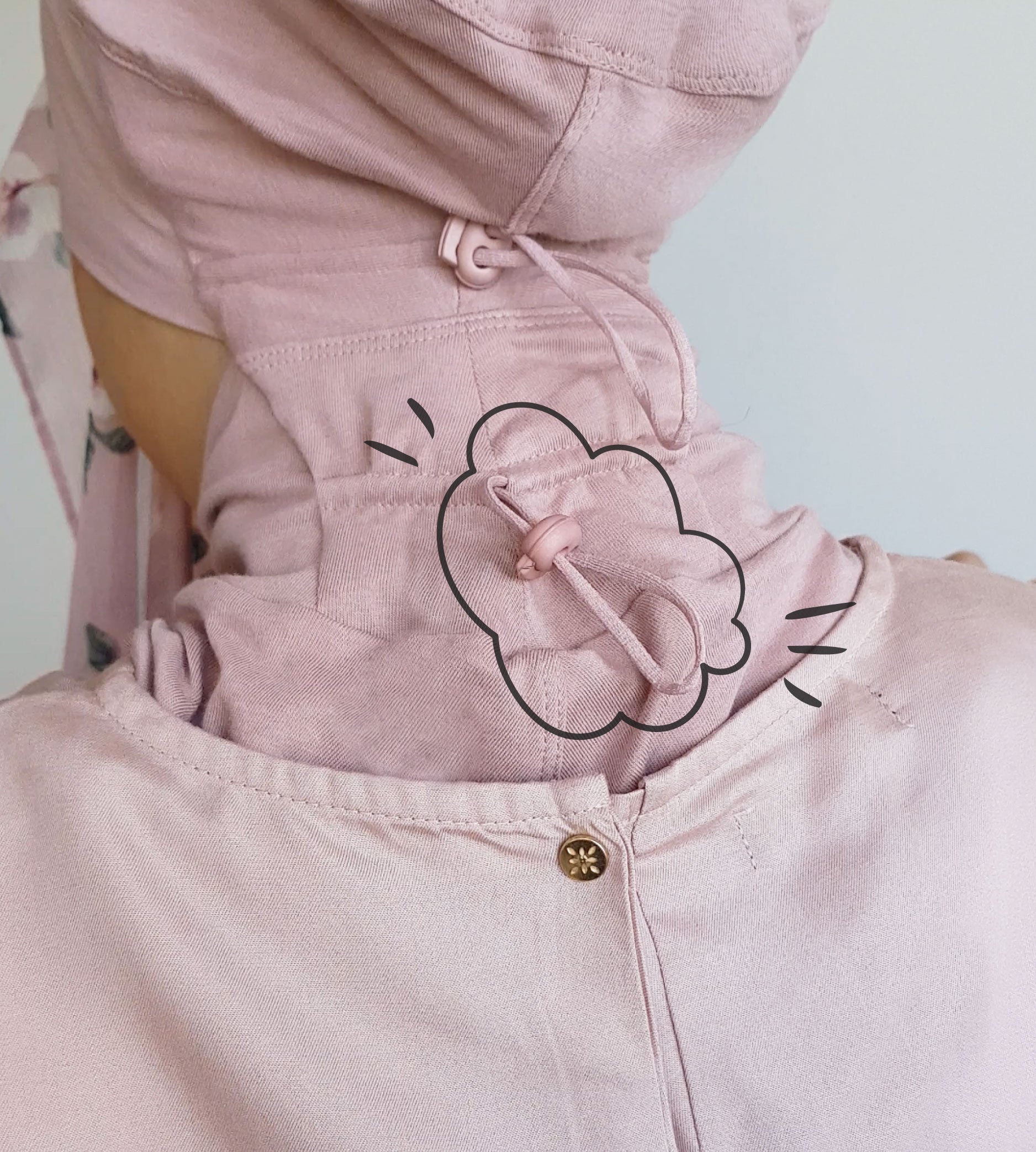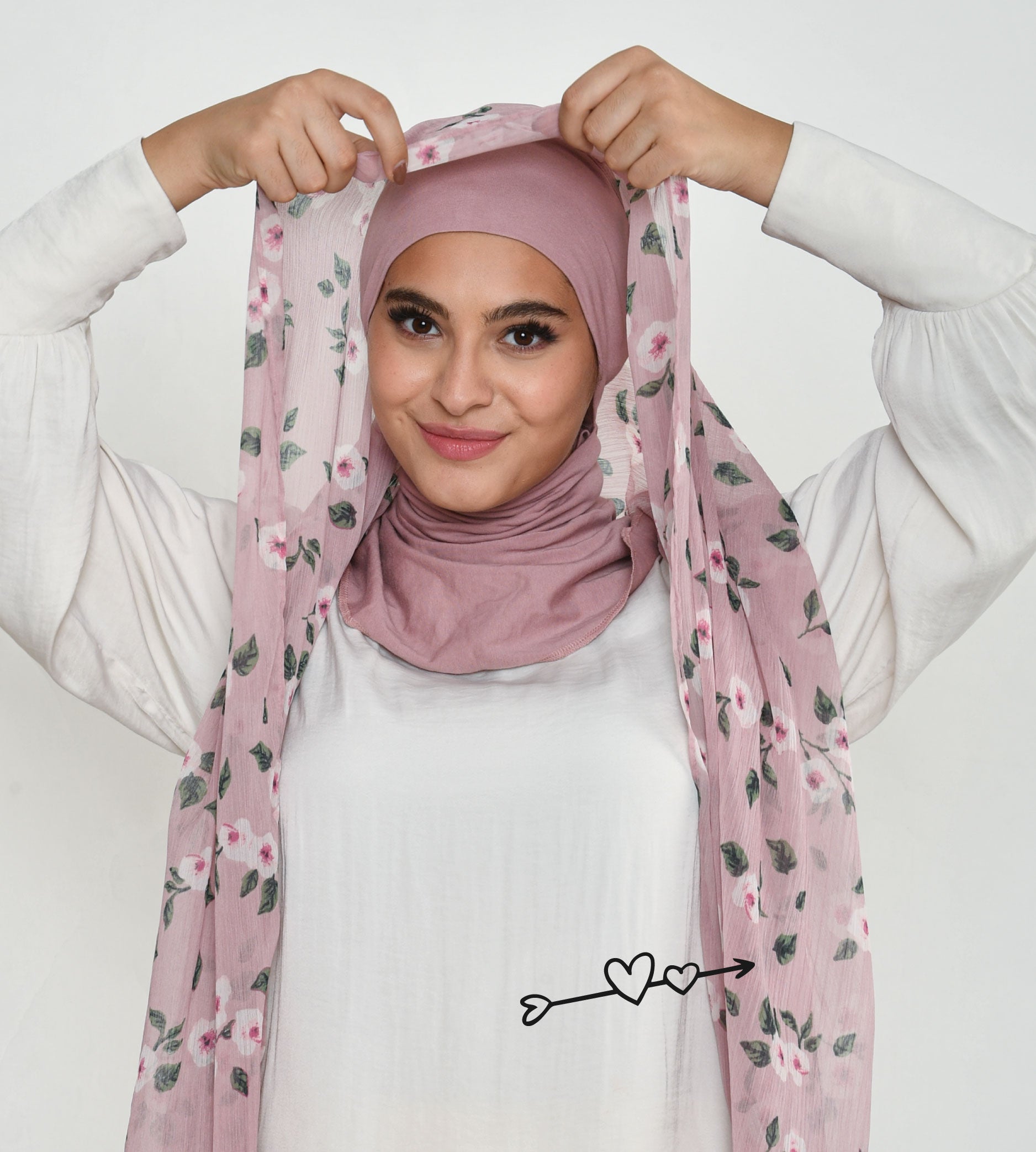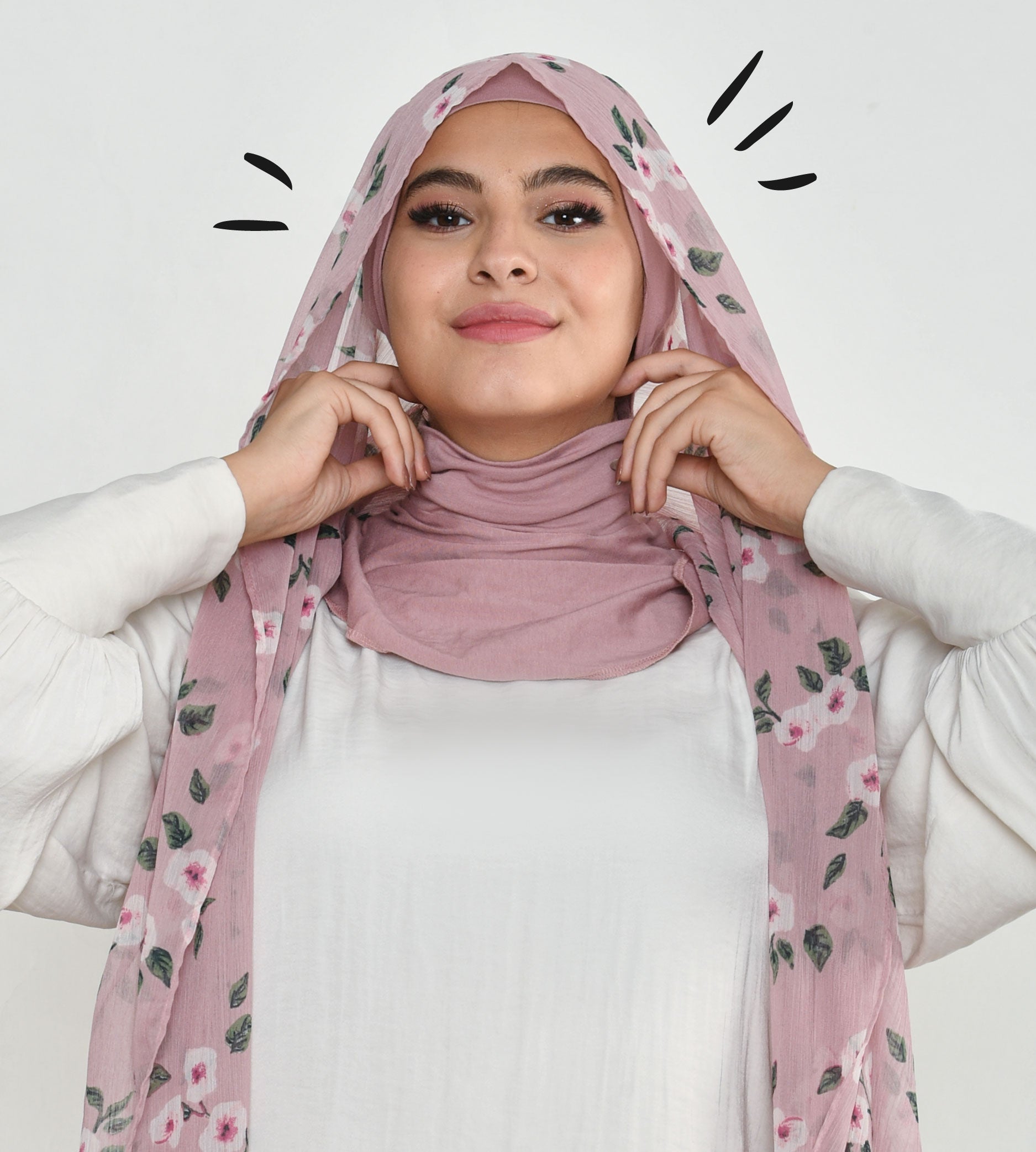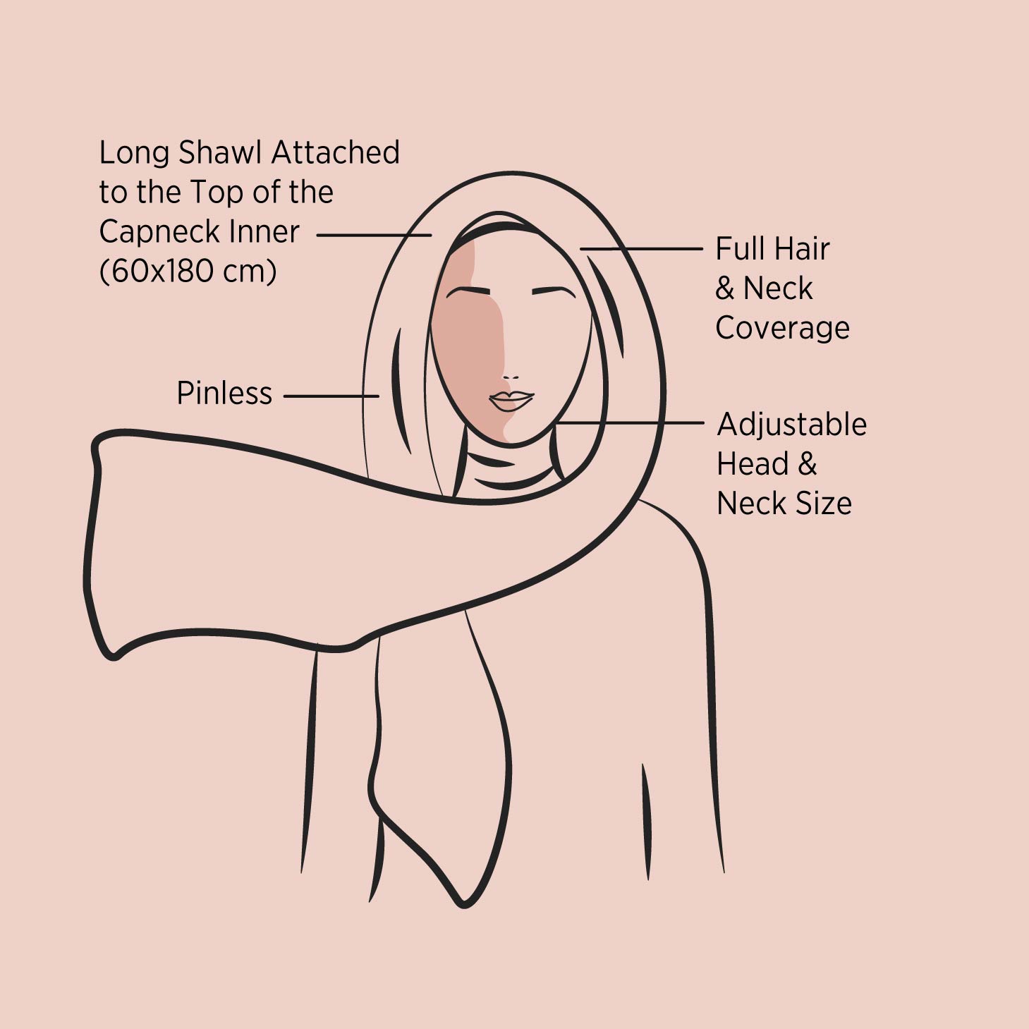 This instant hijab style will let you achieve a loose hijab or a modest turban look in no time. It features two long shawl ends 60x180cm (24x71in) attached to a full coverage inner that covers the hair and neck.